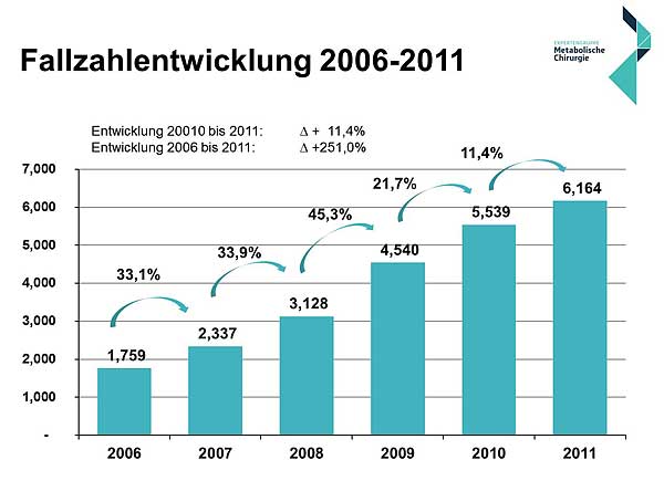 Bildunterschrift (Abb. 1): Entwicklung der Adipositas-chirurgischen Eingriffe in Deutschland. Zwischen 2006 und 2011 ergibt sich eine Zunahme von 251 Prozent