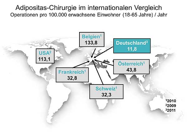 Bildunterschrift (Abb. 2): Adipositas-Chirurgie im internationalen Vergleich: Deutschland bildet hinsichtlich der OP-Zahlen nach wie vor das Schlusslicht