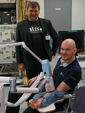 Bildunterschrift: Professor Karsten König (links) hat die Haut des deutschen Astronauten Alexander Gerst mit seinem Femto-Sekundenlaser untersucht.