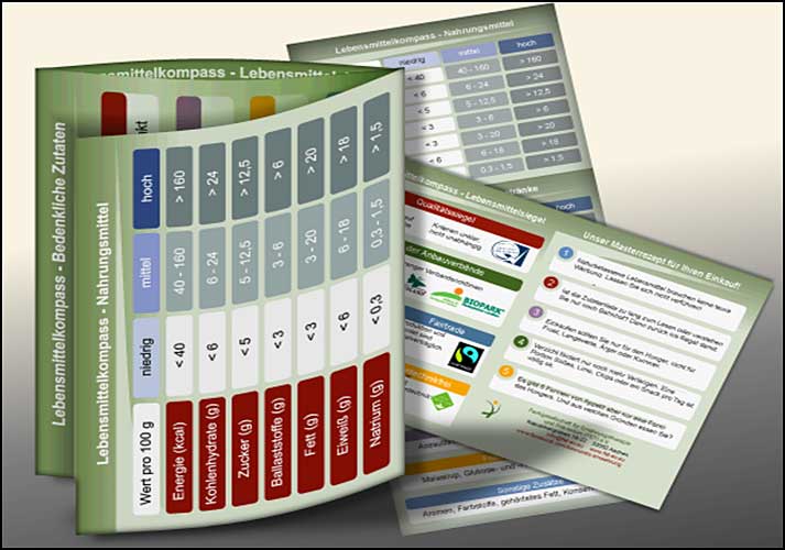Mit der Klappkarte Lebensmittelkompass für den Geldbeutel erhalten Sie wichtige Informationen zum Einschätzen eines Produktes beim Einkauf.