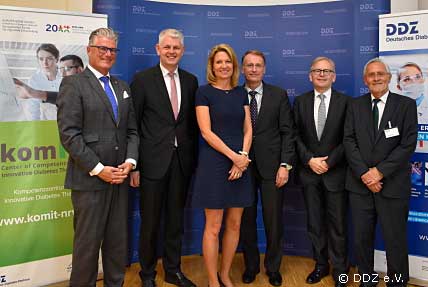 Bildunterschrift: Von links: Prof. Andreas Meyer-Falcke (Beigeordneter für Gesundheit der Landeshauptstadt Düsseldorf), Christoph Dammermann (Staatssekretär im Ministerium für Wirtschaft, Innovation, Digitalisierung und Energie des Landes Nordrhein-Westfalen), Prof. Anja Steinbeck (Rektorin der Heinrich-Heine-Universität Düsseldorf), Prof. Dirk Müller-Wieland (Vorstand der Deutschen Diabetes Gesellschaft), Prof. Michael Roden (Vorstand des Deutschen Diabetes-Zentrums) und Prof. Jürgen Eckel (Managing Director des KomIT) bei der Eröffnungsveranstaltung.