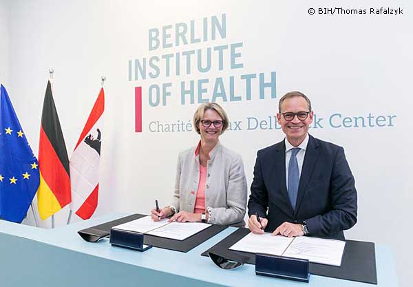 Bildunterschrift: Am 10.7.2019 unterzeichneten Bundesforschungsministerin Anja Karliczek und der Regierende Bürgermeister von Berlin, Michael Müller die Verwaltungsvereinbarung zur Integration des BIH in die Charité.