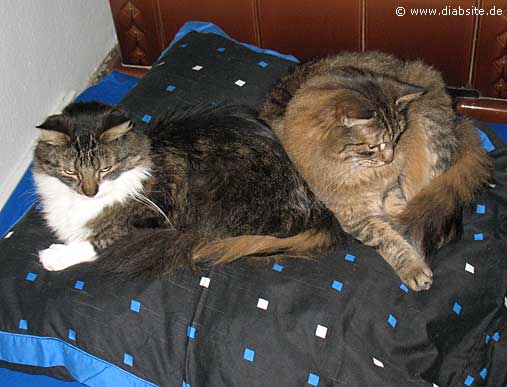 Bildunterschrift: Das Bild von den Katzen der Autorin haben wir aus Datenschutzgründen nicht veröffentlicht. Dafür sehen Sie die Webkater des Diabetes-Portals DiabSite Juri und Dimi (v.l.n.r.).